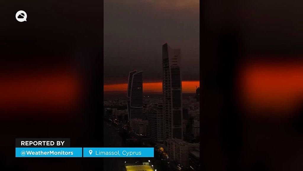 En el video que te presentamos al inicio de esta noticia, se aprecia cómo una nube de humo cubre la ciudad portuaria de Limassol -ubicada al suroeste de Chipre- con colores rojizos detrás de los colosales edificios.