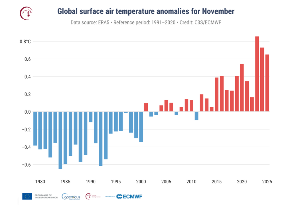 El mes de noviembre de 2025 fue el tercero más cálido registrado para ese mes en particular, con temperaturas 0.65 °C superiores al promedio del período 1991-2020. A nivel global, esto significa que el planeta estuvo 1.54 °C más cálido que en la época preindustrial (1850-1900), cuando la actividad humana aún no había alterado significativamente la composición de la atmósfera.