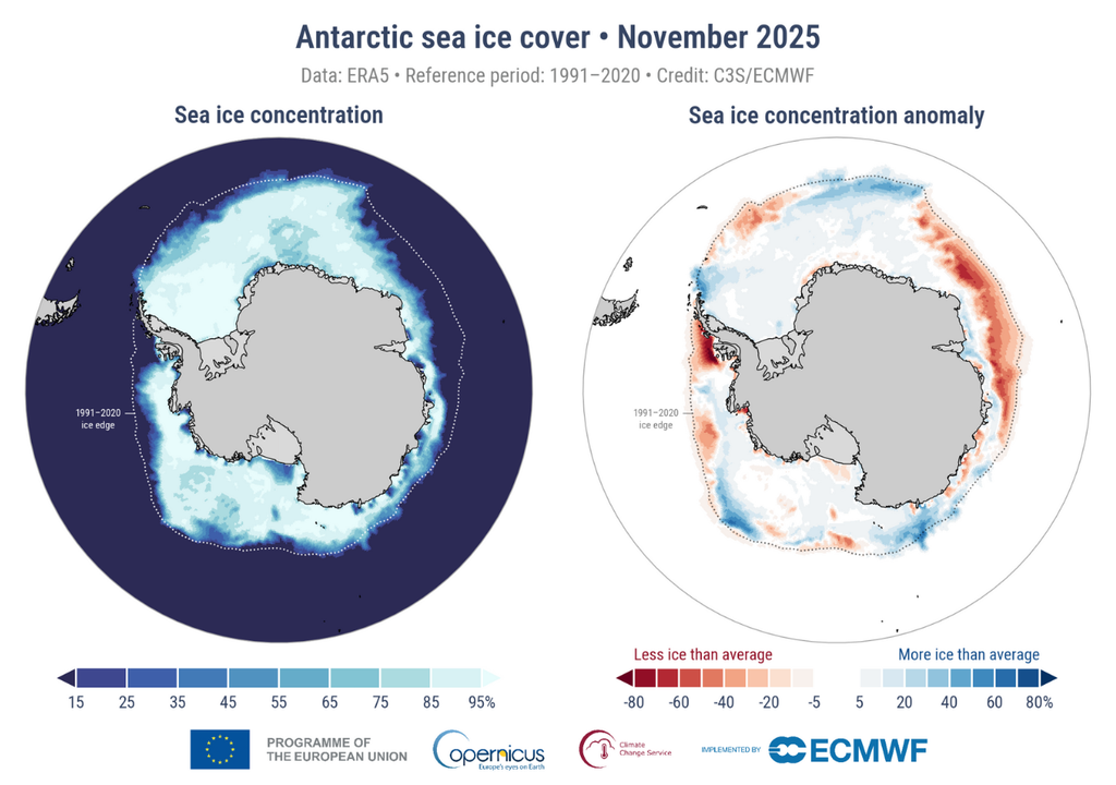 Esta distribución geográfica del calor tiene consecuencias directas y medibles. El crecimiento del hielo marino ártico durante noviembre fue más lento de lo habitual, resultando en la segunda menor extensión mensual registrada para ese mes. El último día de noviembre, la extensión diaria del hielo ártico alcanzó el valor más bajo jamás registrado para esa fecha: apenas 9.74 millones de kilómetros cuadrados.