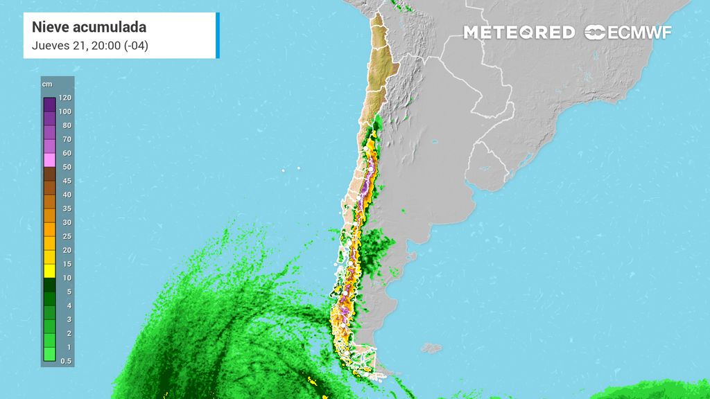 En la cordillera de Valparaíso y Maule, se estiman entre 40 y 60 cm de nieve. En la Región Metropolitana y en O’Higgins, los acumulados podrían ser aún más relevantes, alcanzando entre 60 y 80 cm en solo 24 horas.