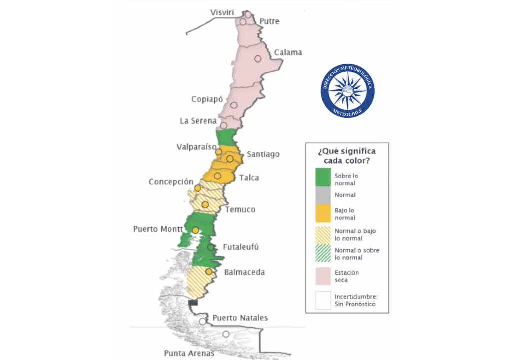 La DMC detalló que para el trimestre mayo, junio y julio, se prevé una estación seca entre la región de Arica hasta Atacama, bajo lo normal entre la Región Metropolitana y del Maule y posibilidades de recibir lluvias en el trimestre, en las regiones de Coquimbo y Valparaíso y condiciones normales o sobre lo normal entre el Ñuble y Los Lagos.