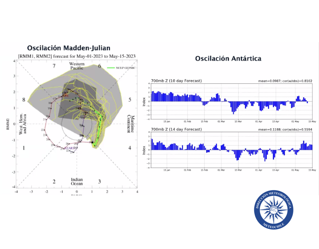 Respecto a eso, podemos ver en la figura que, el pronóstico de la Oscilación Madden Julian (MJO) indica que existe una mayor probabilidad de tormentas hacia las fases 4 y 5 (Continente Marítimo) alejados de las fases 8 y 1, las que contribuyen a favorecer el tiempo tomentoso en el centro y sur de Chile.