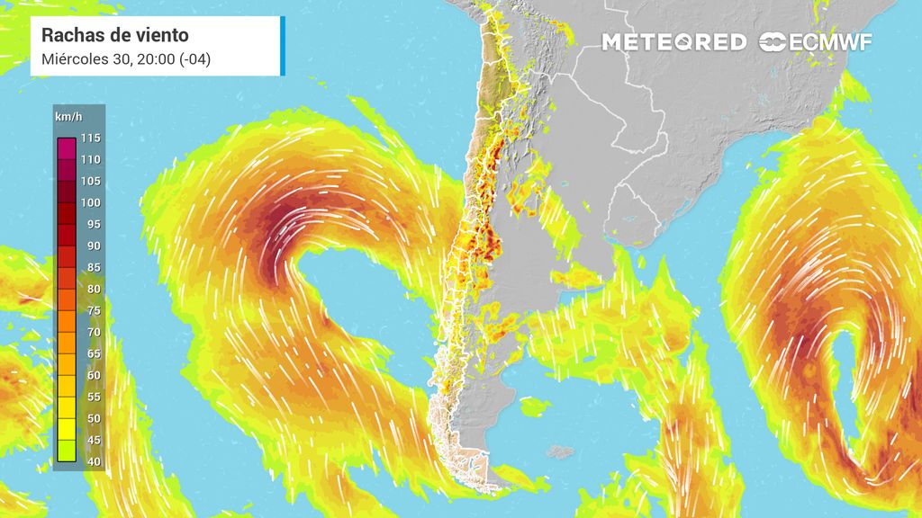 Por su parte, desde la región de Valparaíso y hasta la región del Biobío en todo el centro de Chile se experimentarán valores de la velocidad del viento, que se moverán entre los 50 y los 70 Km/h en rachas, y que según la máxima autoridad encargada de gestionar los fenómenos meteorológicos, serán más pronunciados en zonas costeras y cordilleranas.
