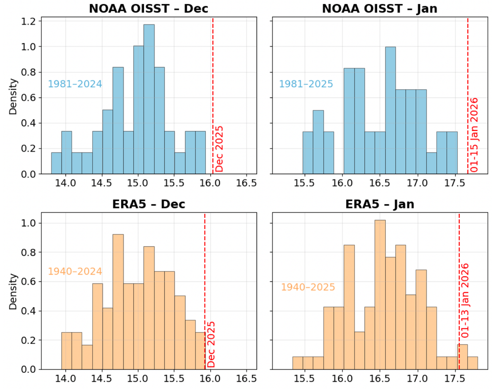 En ambos casos el resultado es el mismo. El calentamiento del mar observado durante el mes de diciembre no tiene precedentes. En otras palabras, en la región observada, diciembre de 2025 (que tuvo un valor cercano a los 16 °C) es el más cálido en el registro.