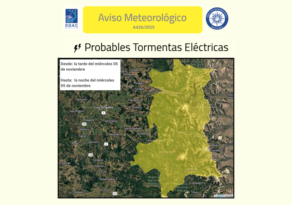 Según indica la DMC en su aviso A426/2025, esta baja segregada aportaría condiciones para el probable desarrollo de tormentas eléctricas, acompañadas por chubascos aislados, en sectores de la precordillera y cordillera de la Región del Biobío. El aviso de la DMC señala que el fenómeno se podría producir entre la tarde y la noche del miércoles 05 de noviembre.