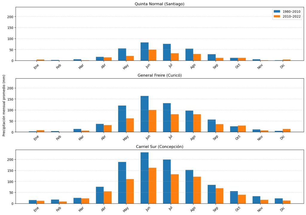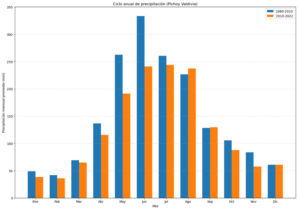 El régimen anual está fuertemente influenciado por el paso de sistemas frontales provenientes del Pacífico Sur. En años secos (muchas veces relacionados con el fenómeno de El Niño-Oscilación del Sur, ENSO), esta zona puede sufrir sequías severas, con importantes consecuencias para la agricultura, el abastecimiento de agua potable y la generación hidroeléctrica.