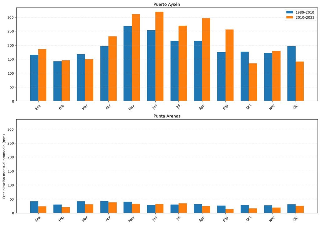 En esta región, las precipitaciones son muy variables según la ubicación. En la costa occidental (como en Puerto Aysén o Puerto Natales), los montos superan fácilmente los 3.000 mm anuales, mientras que en sectores más continentales u orientales, como Punta Arenas, las precipitaciones bajan a unos 400 mm anuales. Esta diferencia se explica por el efecto orográfico: las montañas retienen la humedad del océano, dejando el aire seco al otro lado.
