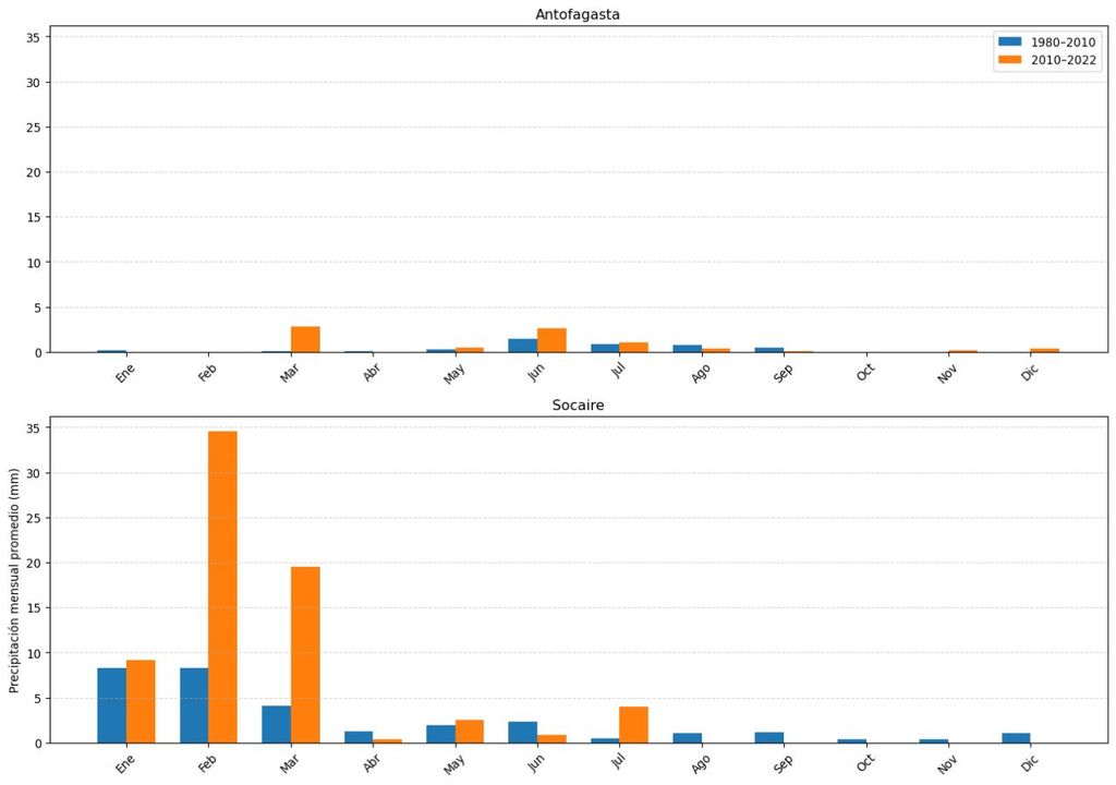 Las escasas lluvias que ocurren en esta zona están asociadas principalmente al fenómeno conocido como el mal llamado “invierno altiplánico”, que ocurre durante los meses de verano austral (enero y febrero). Este fenómeno es producto del transporte de humedad desde la Amazonía hacia los Andes, lo que genera tormentas eléctricas y chubascos, principalmente en sectores precordilleranos y altiplánicos. Sin embargo, en la costa y los valles bajos, este efecto es casi nulo. En muchas ciudades norteñas pueden pasar años sin que caiga una sola gota de lluvia.