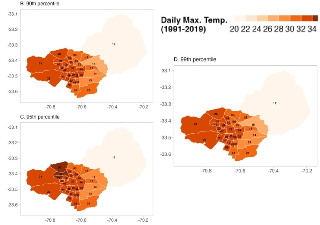 El estudio también reveló una marcada variabilidad espacial del calor extremo dentro de la ciudad, con diferencias de hasta 13 °C en las temperaturas máximas extremas entre comunas. Estas diferencias no son aleatorias y reflejan la presencia de islas de calor urbano, asociadas a factores como menor cobertura vegetal, alta densidad de construcción y desigualdad socioambiental.