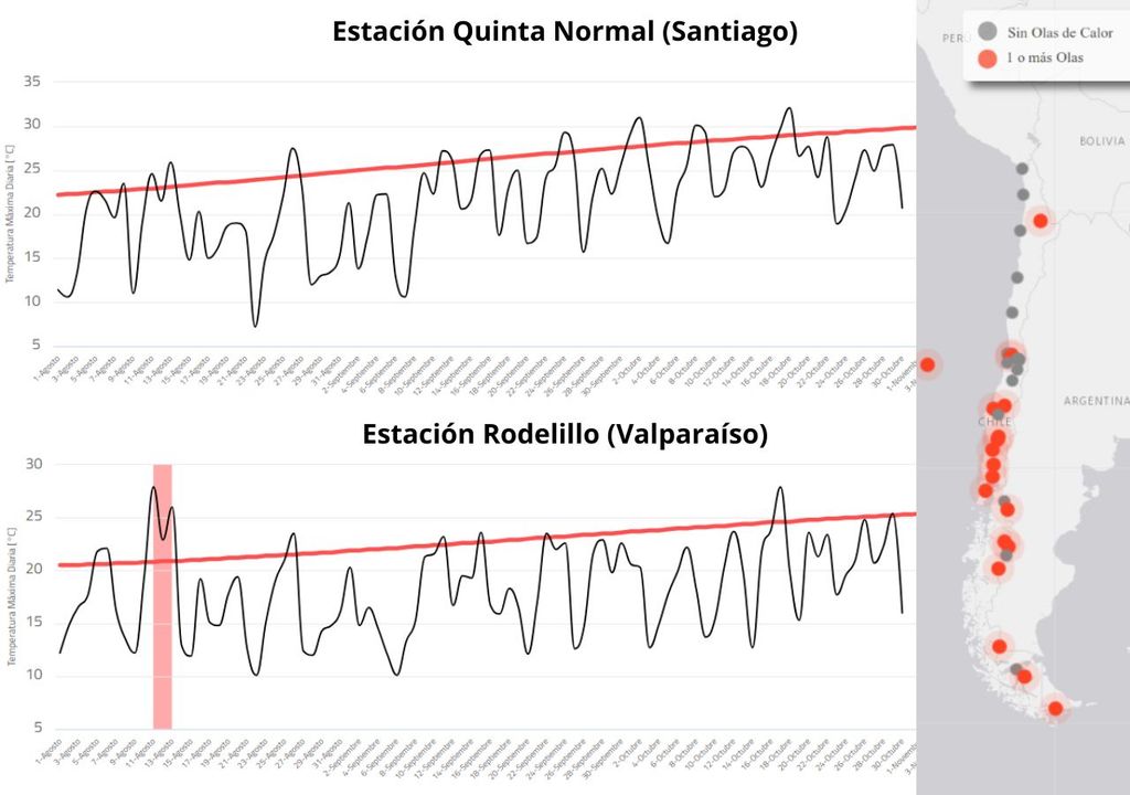 Este monitoreo permite visualizar, para cada estación, cuándo se superó el umbral, cuántos días duró el evento y su intensidad. También se puede consultar mapas interactivos donde se destacan estaciones que han registrado olas de calor recientemente