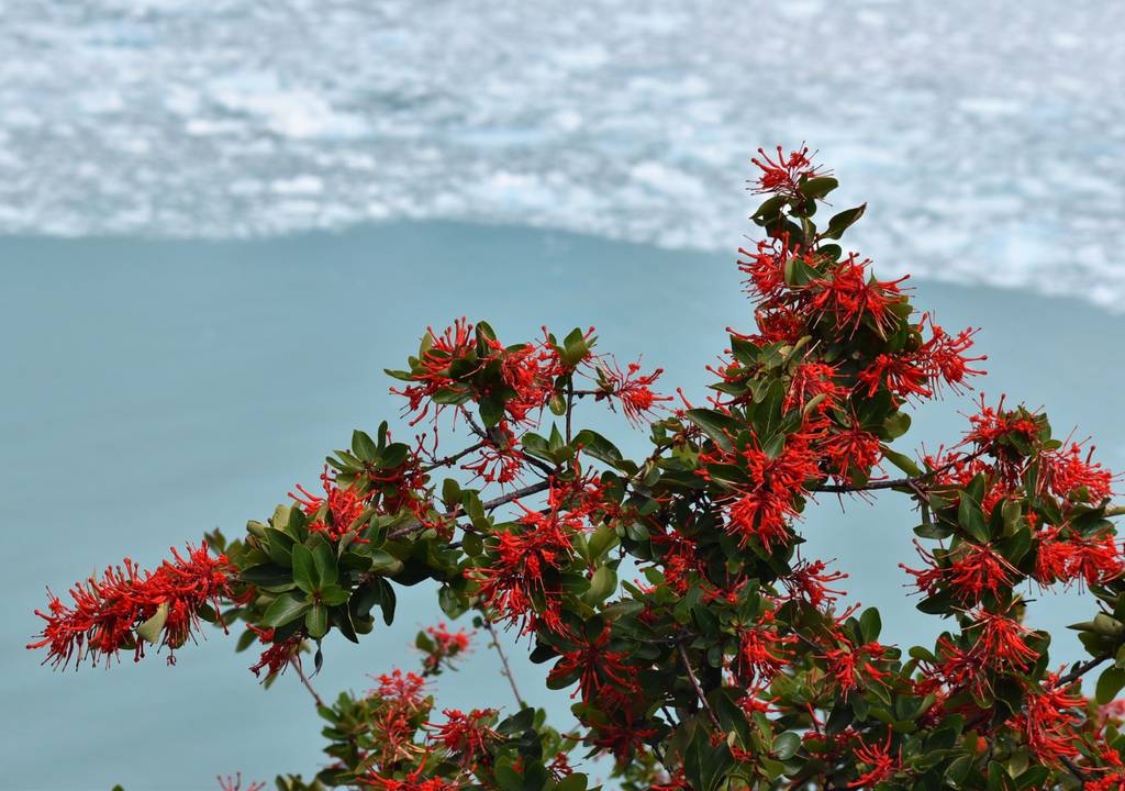 Muchos viajeros lo reconocen de inmediato: sus flores parecen llamaradas que contrastan con el gris de los glaciares o el blanco de las cumbres nevadas. No es raro ver fotógrafos deteniéndose en la ruta solo para capturar ese rojo inconfundible.