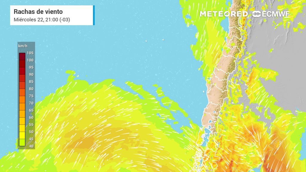 Por ejemplo, el dominio anticiclónico provocará que las rachas de viento se presenten en torno a los 40 km/h en el litoral de las regiones de Ñuble y Biobío en horas de la tarde del martes 21 de octubre (imagen inferior).