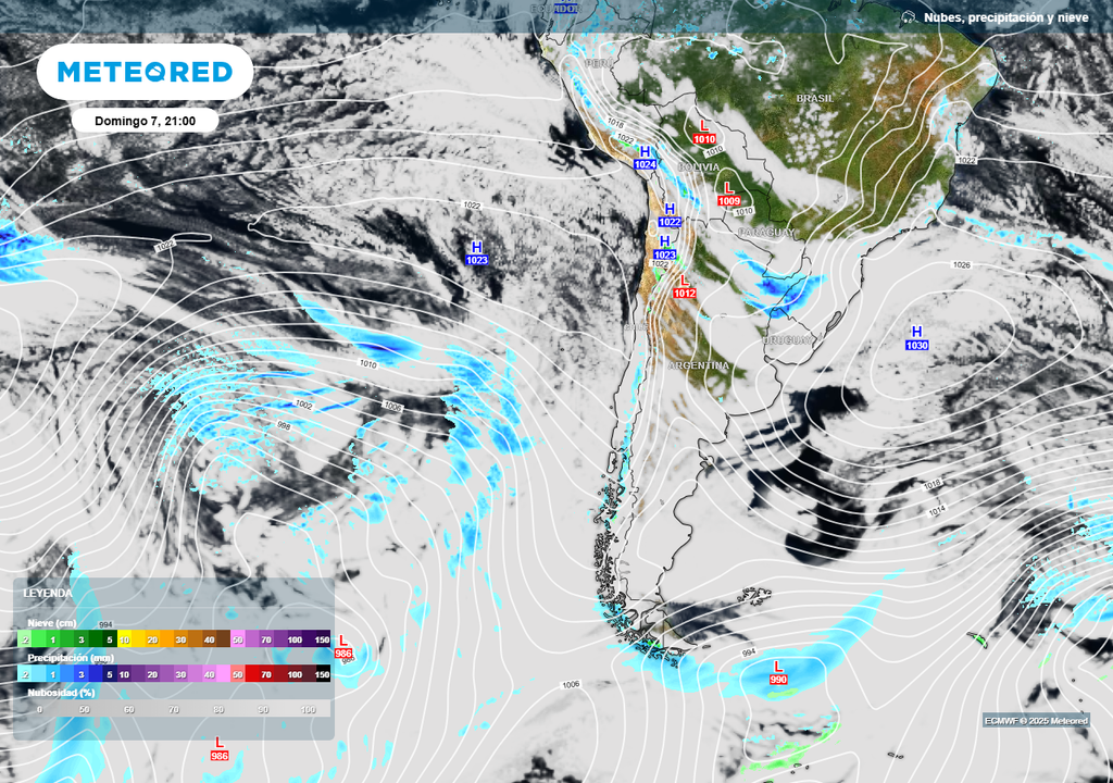 Hacia el fin de semana, el panorama comienza a modificarse. El anticiclón del Pacífico, que hasta ahora ha actuado como barrera, tenderá a debilitarse y desplazarse levemente hacia el norte.