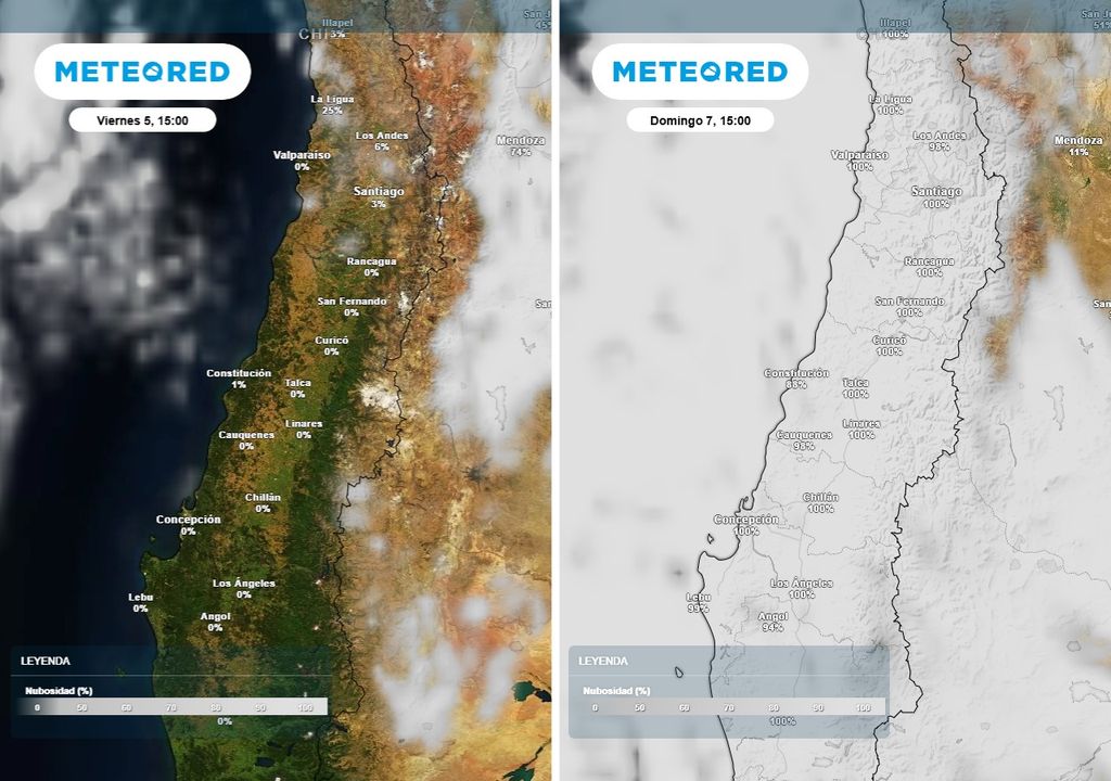 El modelo ECMWF proyecta que desde el domingo en la mañana la zona central estará cubierta de nubes. El proceso se intensificará hacia la tarde y noche, momento en que existe probabilidad de precipitaciones débiles en diversas ciudades, particularmente en sectores costeros y valles interiores.