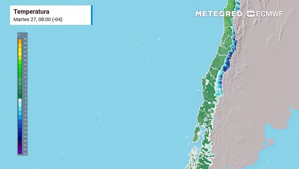 Un anticiclón migratorio hará que una burbuja de aire muy frío viaje desde el sur para afectar los valles de la zona central. Por tanto, este miércoles (28) se espera que podamos alcanzar la mañana más fría de la cual se tiene registro este año, cuando los termómetros bajen durante el amanecer a temperaturas que, en algunos casos, se ubicarían bajo los 0 °C.