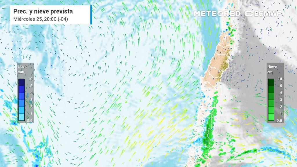 En la imagen de este apartado te presentamos la precipitación acumulada, donde se observa que los montos de agua caída más elevados se concentrarían en la provincia de Arauco con cifras que rondan los 25 mm, si sumamos las lluvias previstas desde el martes hasta el viernes.
