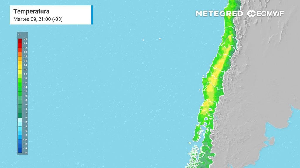 La presencia de nubosidad costera este martes (9) frente a la zona central del país contribuirá a moderar ligeramente las temperaturas en Santiago. Aunque las máximas en el centro de la ciudad rondarán los 30 °C, el ingreso de aire más fresco desde la costa ayudará a contener los valores extremos, aun cuando la jornada seguirá siendo calurosa.