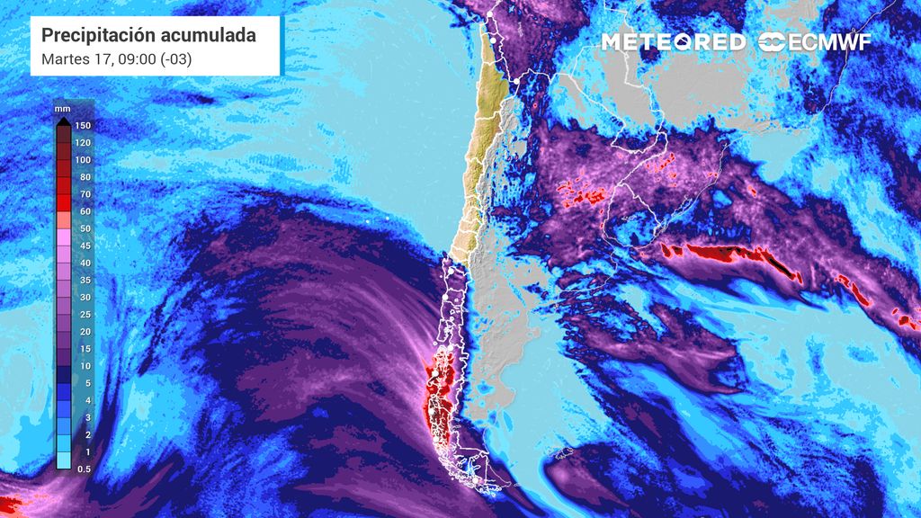 En la noche del día 16, el frente dejará sus lluvias sobre las regiones de Magallanes, de Aysén, Los Lagos, Los Ríos y también sobre La Araucanía y del Biobío. Sobre el litoral interior de Los Lagos y en la costa de Los Ríos, el temporal de viento llegará con rachas que rondarán 100 km/h cerca de la medianoche.