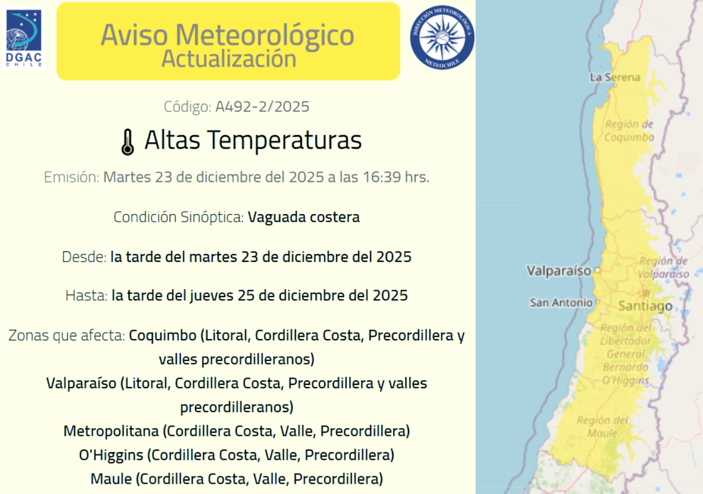 La Dirección Meteorológica de Chile (DMC) ha emitido un aviso meteorológico oficial por vaguada costera que estará vigente desde el martes 23 hasta el jueves 25 de diciembre. Este sistema afectará desde la región de Coquimbo hasta la del Maule, abarcando territorios desde el litoral hasta la precordillera.