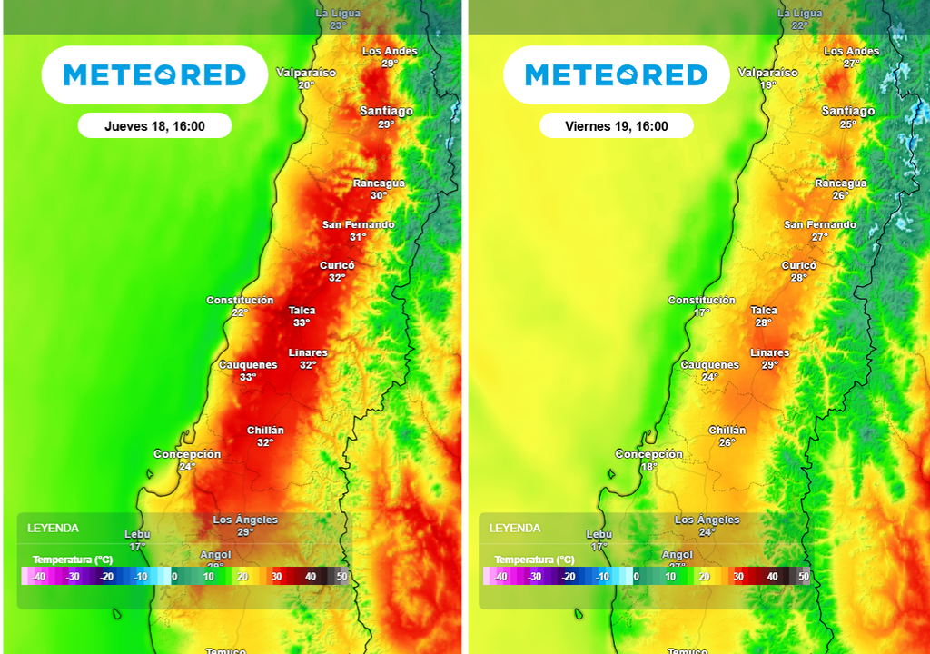 El viernes (19) continuará la tendencia cálida, aunque con un leve descenso en algunas localidades. Santiago subirá levemente a 29 °C manteniendo condiciones soleadas, mientras que Talca bajará a 29 °C y Chillán a 27 °C. Los Andes experimentará un descenso más notorio llegando a 28 °C con cielos parcialmente nubosos, señal temprana del cambio de patrón atmosférico. Las costas mostrarán estabilidad térmica con valores entre 17 °C y 20 °C.
