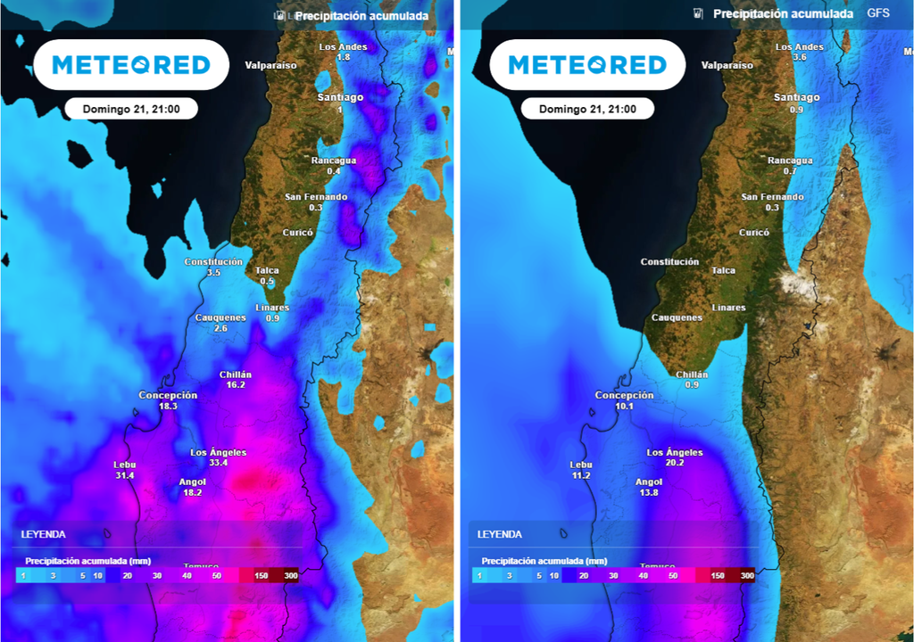 Los Ángeles será la ciudad más afectada con 90% de probabilidad de lluvia moderada, acumulando hasta 18 milímetros, además de posibilidad de tormentas eléctricas. Concepción registrará cielos completamente cubiertos con 90% de probabilidad de lluvia y acumulados de 7 milímetros aproximadamente.