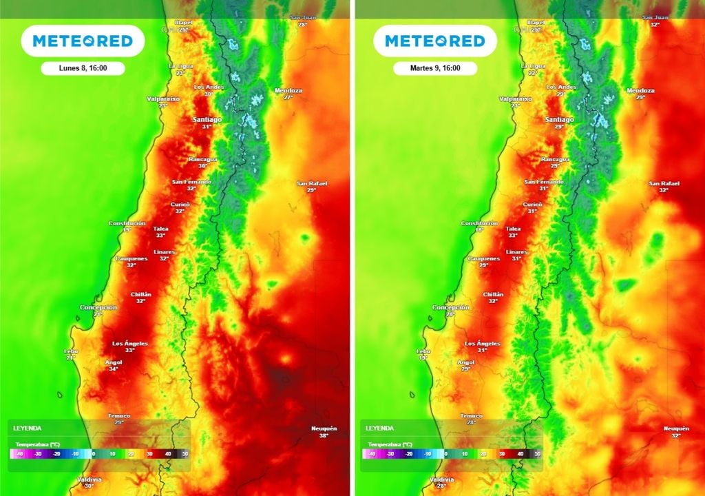 Los días lunes (08) y martes (09) estarán marcados por la presencia de una dorsal en altura que favorecerá cielos despejados y un notable aumento de las temperaturas. Santiago alcanzará máximas de 33 °C el lunes y 30 °C el martes, mientras que en Talca y Chillán los termómetros llegarán hasta los 34 °C y 33 °C respectivamente. Rancagua y Los Ángeles también experimentarán temperaturas superiores a los 30 °C.