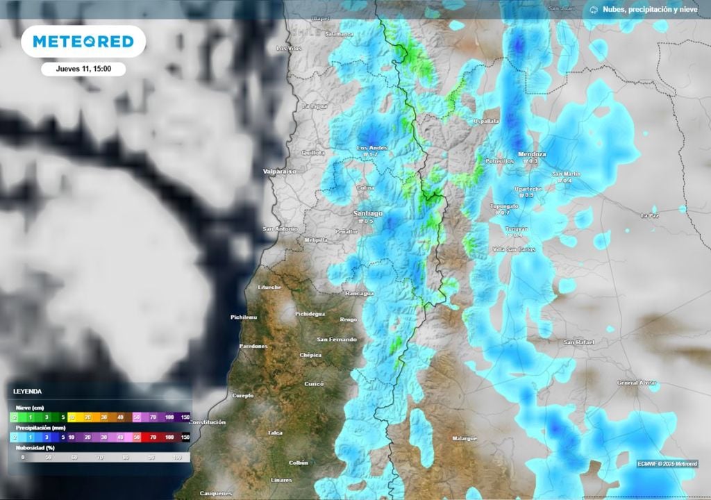 El sector de Los Andes será el más afectado, con un 90% de probabilidad de precipitaciones y acumulados de 3.7 mm. Además, existe probabilidad de tormentas en el sector. Santiago no escapará de esta influencia: se prevé un 80% de probabilidad de lluvias con 2.2 mm acumulados y posibilidad de actividad eléctrica. Las temperaturas descenderán notablemente, con máximas de solo 26 °C y mínimas de 13 °C.
