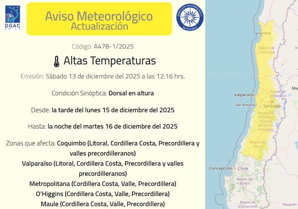 La Dirección Meteorológica de Chile (DMC) ha emitido avisos por altas temperaturas para diversas comunas de la zona central, anticipándose a las condiciones extremas que se desarrollarán especialmente entre el lunes y el miércoles. Estos avisos responden a proyecciones que indican temperaturas con potencial impacto en la salud de grupos vulnerables y aumento del riesgo de incendios forestales.