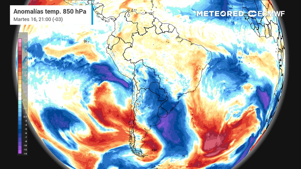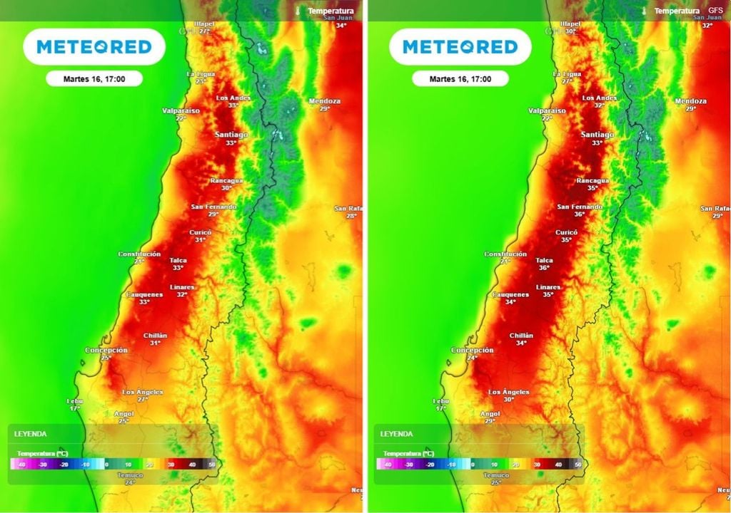 Complementando este escenario, una baja costera se mantendrá activa. Este sistema de baja presión en superficie genera un flujo de vientos del este impidiendo el avance del aire marino hacia el interior lo que provoca temperaturas moderadas en el litoral (entre 17°C y 22°C) pero intensifica el calentamiento en el interior por efecto de compresión adiabática. La interacción entre ambos sistemas produce el contraste térmico característico: mientras Pichilemu y Constitución no superarán los 21°C, ciudades como Santiago, Talca y Chillán alcanzarán máximas de hasta 34°C el martes.