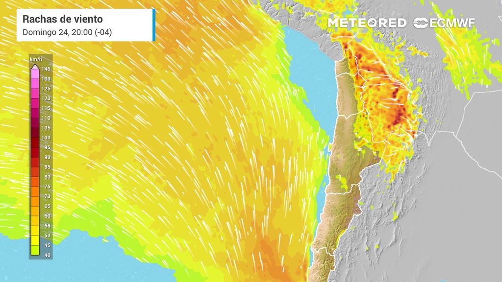 Para la tarde del sábado, nuestra referencia meteorológica destaca que las rachas de viento más intensas -dentro del tramo geográfico que abarca la alerta de la DMC- se pronostican para la Región de Antofagasta con cifras que superarían los 100 km/h (imagen inferior).
