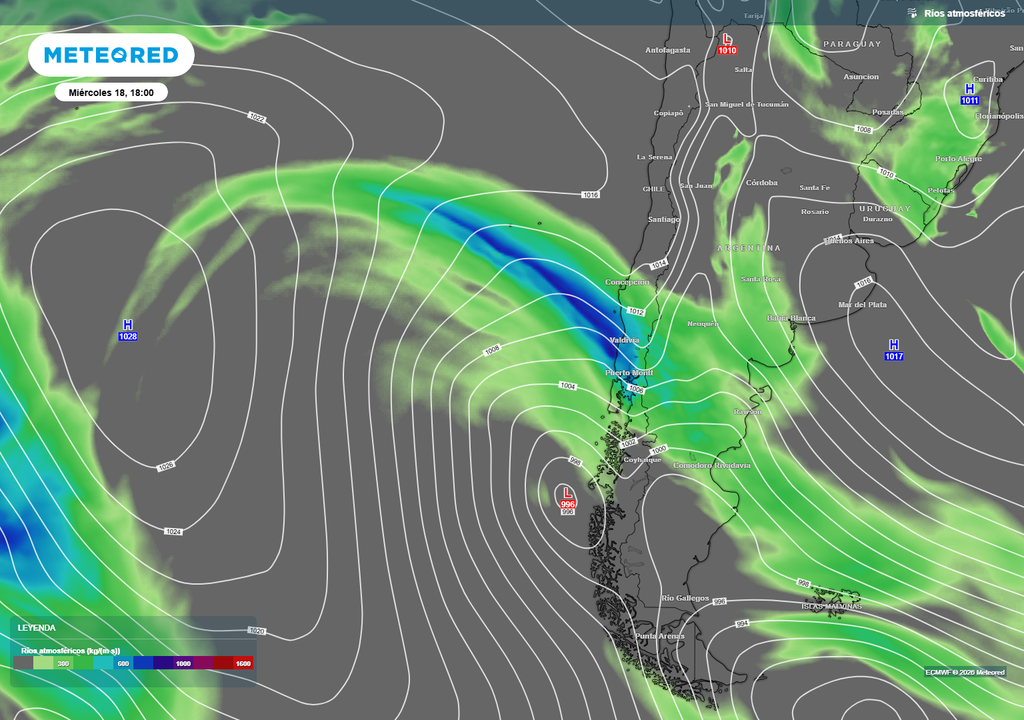 Datos de los modelos de pronóstico, usados por Meteored, indican que el próximo sistema frontal que avanzará por Chile se encontrará en su camino con un nuevo río atmosférico, que incrementará sus lluvias tanto en sectores del sur como del centro sur.