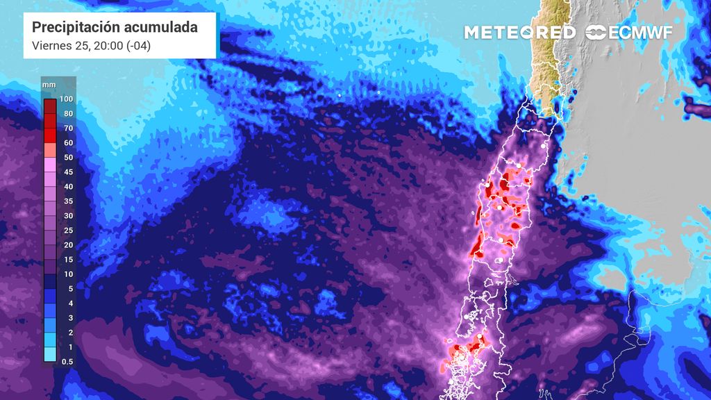 Además, dentro del período de tiempo indicado, se acumularían entre 60 y 80 cm de nieve en la Cordillera de Los Andes de la Región de Biobío, mientras que algunos copos de agua nieve se dejarían caer en la Cordillera de Nahuelbuta, escenario atmosférico que se grafica en la imagen superior.