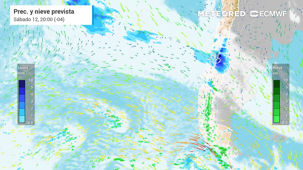 Además, sobre la Cordillera Patagónica de la Región de Magallanes, este sistema frontal dejaría cerca de 80 cm de nieve a lo largo del fin de semana.
