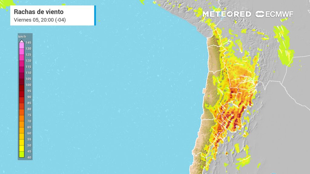 Para el jueves 04 de septiembre se pronostican rachas de viento superiores a los 100 km/h en la alta cordillera comprendida entre las regiones de Antofagasta y Atacama (imagen superior).