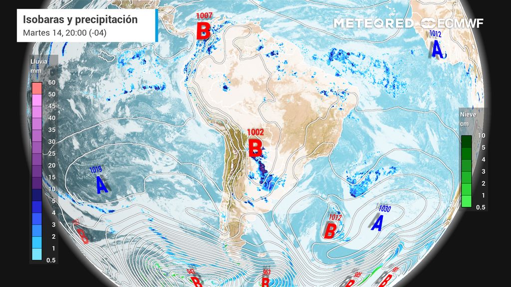 El centro de baja presión asociado a este sistema cruzará Magallanes, intensificando las precipitaciones durante la noche y madrugada del martes. En este periodo, las lluvias se extenderán entre Los Ríos y Magallanes.