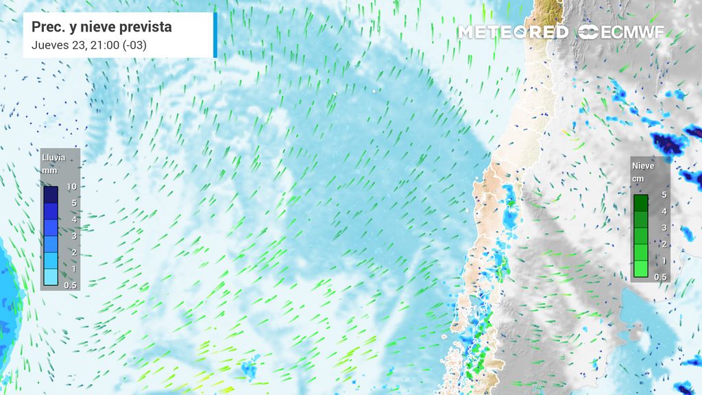 A medida que avance el margen frontal, también lo harán las lluvias, ya que a contar de la tarde del jueves se presentarían en el valle, la precordillera y cordillera de Los Andes de las regiones de La Araucanía y Los Ríos (imagen superior).