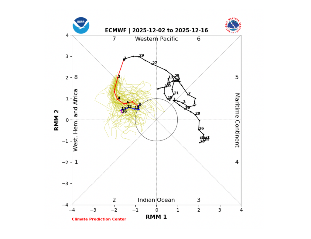 Por último, cabe señalar un posible ingrediente final. Y es que la oscilación Madden-Julian (MJO) ha entrado en los cuadrantes que son más favorables para la precipitación en Chile. En otras palabras, la MJO está en la posición justa para generar un impacto en Chile central.