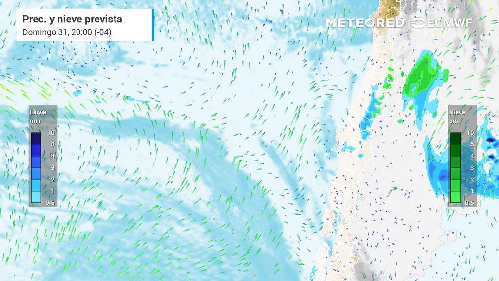 En Los Andes y zonas cordilleranas, se espera un patrón más húmedo que en el resto de la región. Desde el viernes al domingo se registrarían chubascos intermitentes, con acumulados estimados sobre 10 mm en total y nieve que podría superar los 15 cm.