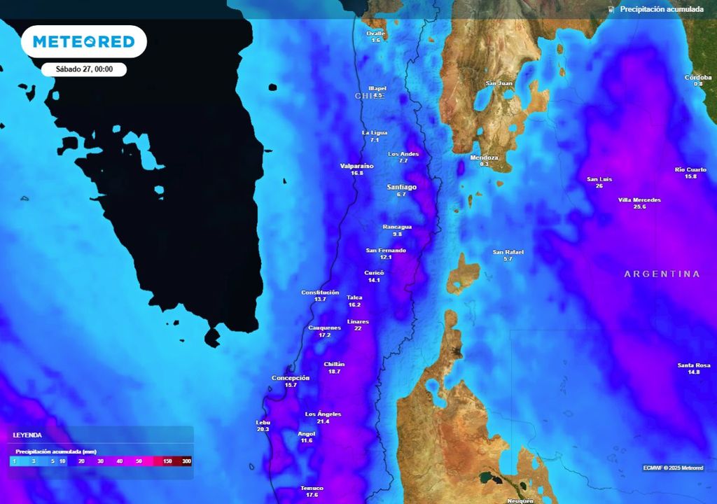 En el litoral de Valparaíso podrían acumularse hasta 15 mm, mientras que en el interior, como en San Felipe y Los Andes, se esperan alrededor de 6 mm. Más al sur, en la región de O’Higgins, las lluvias alcanzarán valores cercanos a 12 mm en la costa y 9 mm en el interior.
