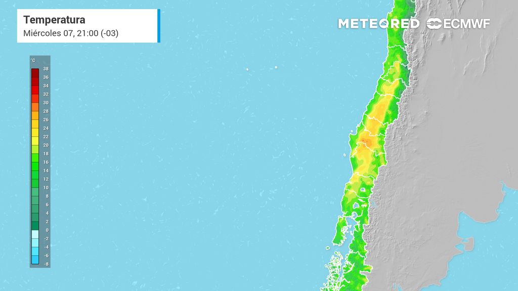 Según las últimas actualizaciones del modelo europeo ECMWF, las temperaturas podrían alcanzar valores cercanos a los 33 °C en el centro de Santiago durante el viernes (09).