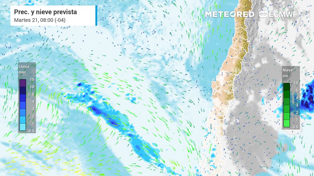 Las últimas salidas de los modelos meteorológicos indican que la lluvia llegaría a la Región Metropolitana durante la madrugada del lunes 20. El avance sería paulatino. Según el modelo europeo, las primeras precipitaciones se presentarían en localidades del sur, como Melipilla, San Pedro, El Monte, Paine y Buin.