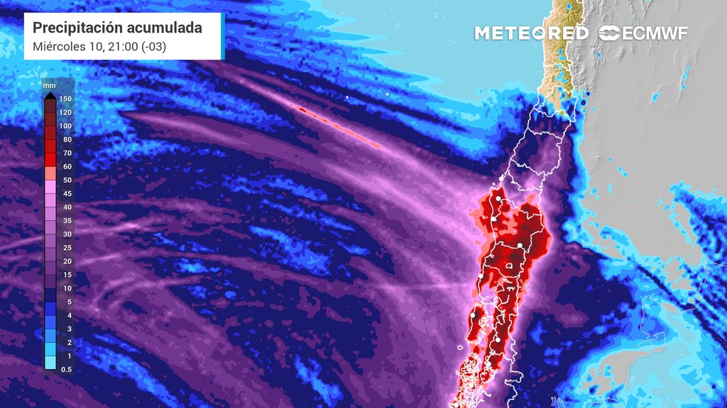 Los montos de agua caída -acumulados desde el lunes hasta el miércoles- oscilarán entre los 90 y 100 mm en Tirúa y Curanilahue (imagen superior), mientras que hasta 70 mm podrían sumar en Cañete y Santa Juana. Además, los pluviómetros se moverán entre los 40 y 50 mm en Lota, Mulchén y Santa Bárbara.