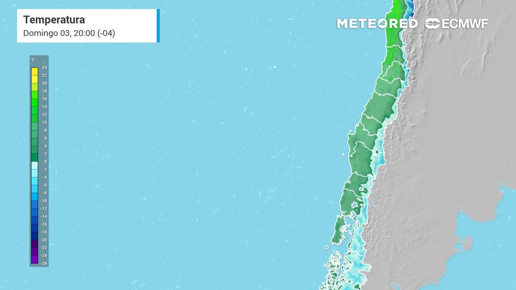 Las mínimas estarán en torno a los 7 u 8 °C en la costa, 5 a 6 °C en los valles y menos de 5 °C en la precordillera. Las máximas subirán levemente, situándose entre 16 y 17 °C en la mayor parte de la región.