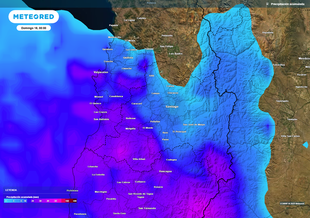 Las precipitaciones avanzarán —más débiles y menos abundantes que otros tramos de la zona central— hasta sectores como Quillota, en la Región de Valparaíso, y Colina y Tiltil en la Región Metropolitana. Los acumulados en este tramo más norte del frente sumarán entre 3 y 8 mm.