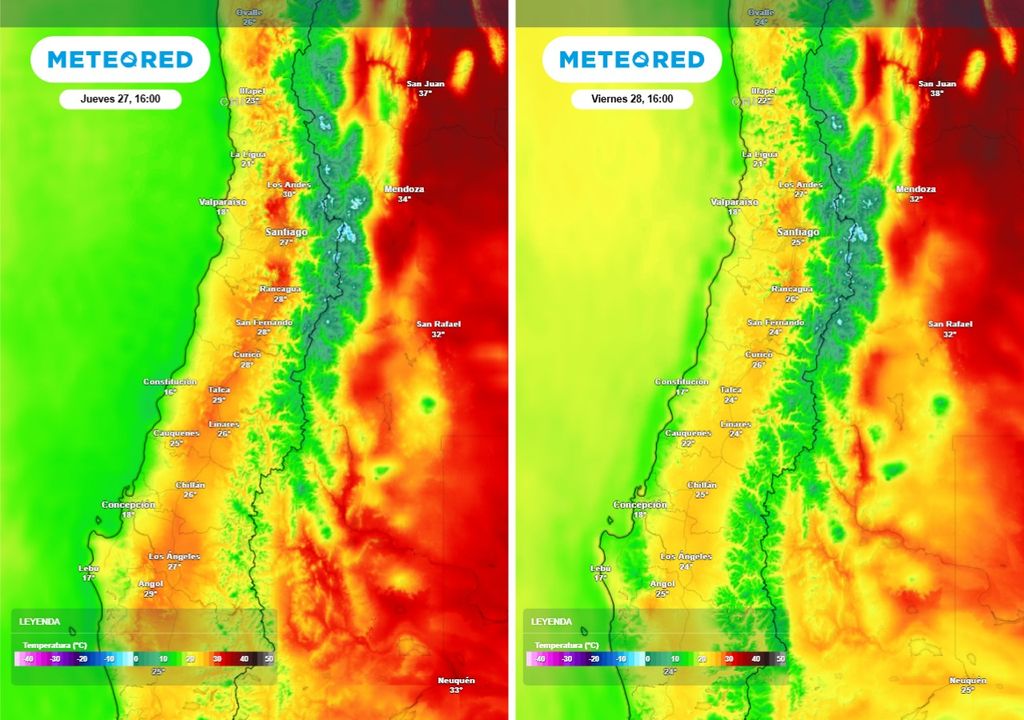 Las temperaturas se mantendrán agradables en la zona central durante los primeros días, con máximas entre los 26 y 29 °C el jueves, antes de experimentar un leve descenso hacia el fin de semana producto de la influencia del sistema frontal.