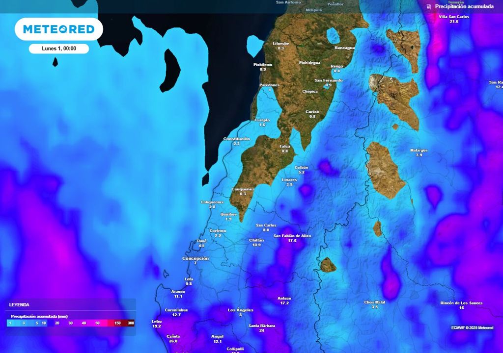 Los Ángeles también verá lluvias con 0.8 mm esperados. Las zonas costeras como Cobquecura y Constitución experimentarán precipitaciones más moderadas. La zona central, desde Santiago hacia el norte, se mantendrá mayormente seca y soleada, con temperaturas estables alrededor de los 25 y 26°C.