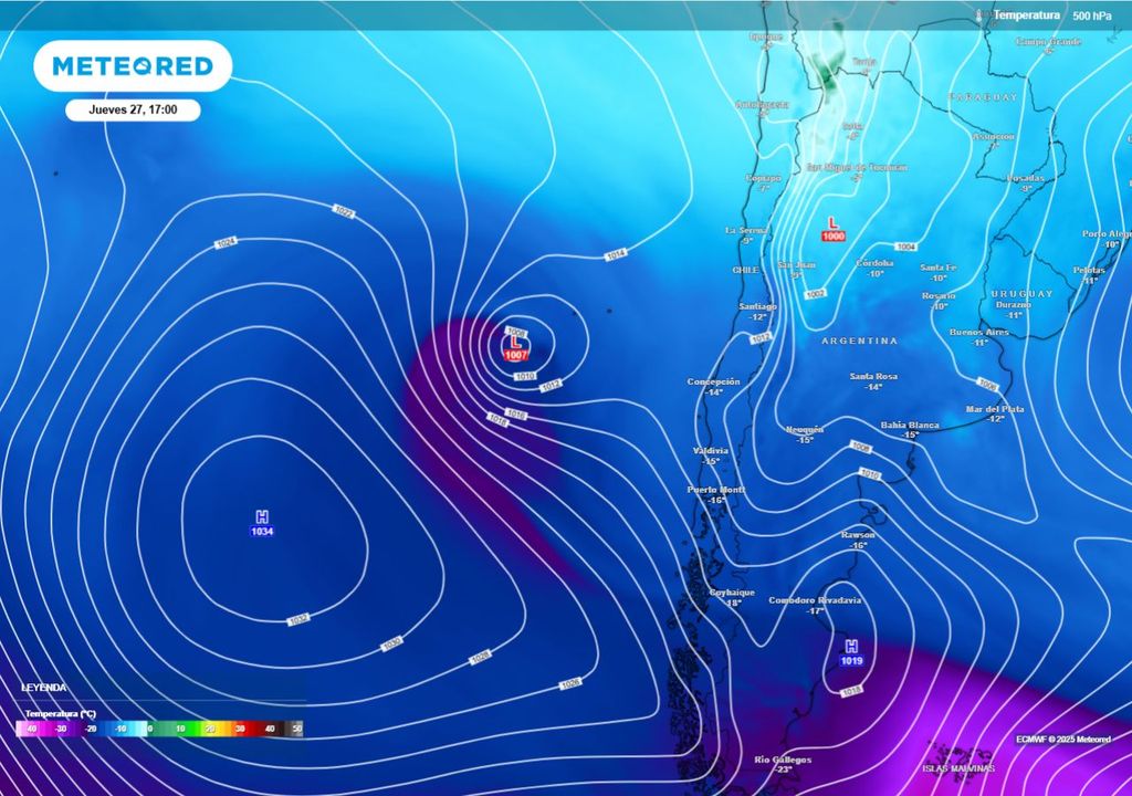 El modelo meteorológico europeo ECMWF anticipa la formación de una baja segregada y un ciclón extratropical que comenzará a desarrollarse durante la madrugada del jueves 27 frente a la costa centro-sur de Chile. Este sistema traerá consigo precipitaciones que se intensificarán gradualmente desde el viernes (28), afectando principalmente a las regiones desde O'Higgins hacia el sur.