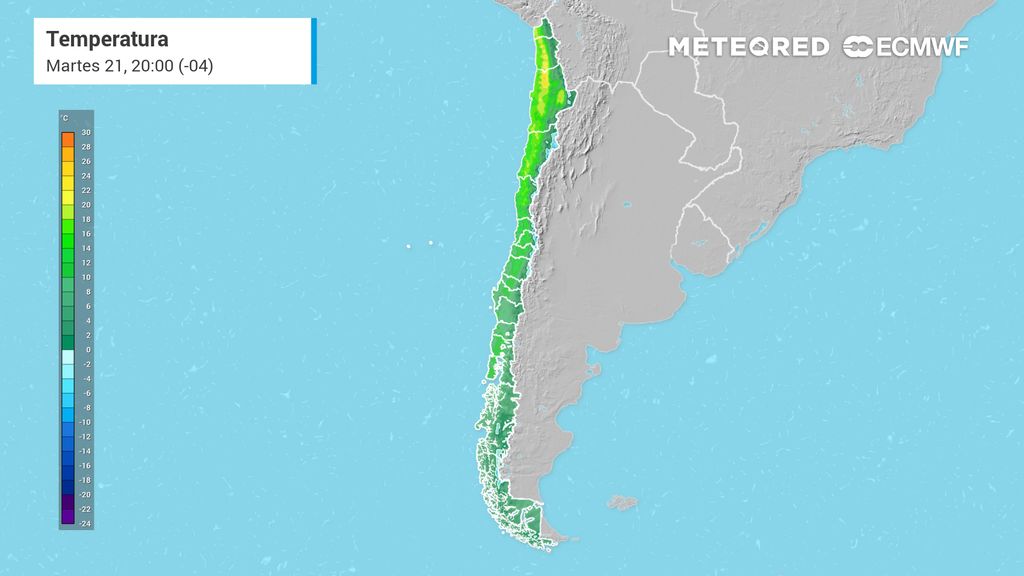 Según las proyecciones del ECMWF, las mínimas tenderán a estabilizarse cerca de los 10 °C desde el jueves, mientras que las máximas oscilarán entre los 21 y 23 °C en Santiago.