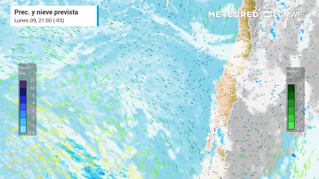 Según el modelo europeo ECMWF, el aumento de la nubosidad comenzaría durante la madrugada del domingo, mientras que las primeras precipitaciones en sectores cordilleranos podrían registrarse en las primeras horas de la mañana.