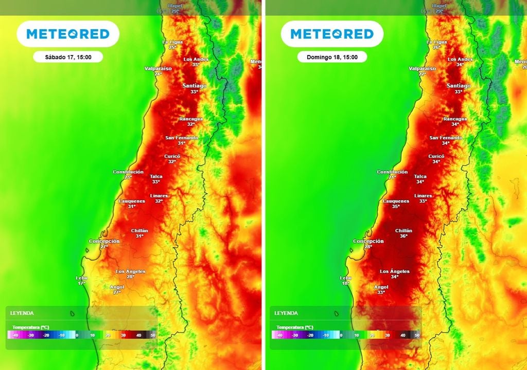 Según las proyecciones del modelo ECMWF, las mayores temperaturas se registrarán en los valles interiores y sectores precordilleranos. En la región Metropolitana, Santiago podría alcanzar máximas cercanas a los 34 o 35 °C, mientras que en Los Andes y Rancagua los valores también se ubicarán sobre los 33 °C durante el fin de semana.